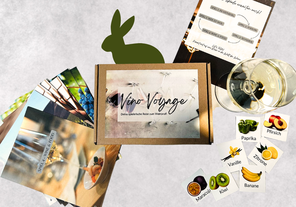 Mit Vino Voyage - dem Weinspiel, werdet ihr ganz spielerisch zum Weinprofi. Begebt euch mit uns auf eine spannende Reise in die Welt der Weine. Wir schicken euch 6 Weine und das Spiel nachhause - ihr spielt ganz entspannt mit euren Liebsten im Wohnzimmer. In 5 verschiedenen Spielen, lernt ihr alles über die leckeren Tropfen in euren Gläsern. Wir starten mitten im Weinberg, lernen und spielen uns durch Terroir und Sensorik, bis wir dann zum Schluss gemeinsam das perfekte Wine & Food Pairing kreieren. Auf euch wartet jede Menge Spielspaß und ein unvergesslicher Abend mit euren Liebsten.